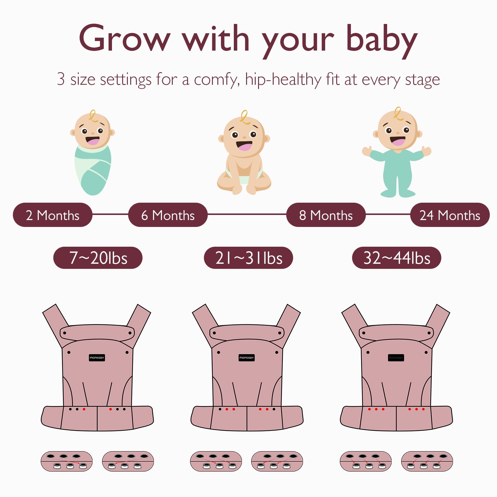 - Grows with Your Baby: This baby carrier is designed to grow with your child from 3 months up until they are a toddler. Adjustable to three sizes, supporting 7-44 lbs. Ensures an ergonomic "M" position for healthy hip and spine development, with padded leg openings for circulation and comfort.